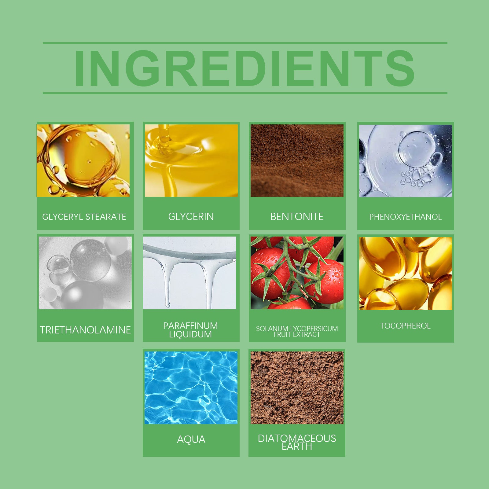 Our green tomato cleaning mud film contains bentonite and diatomaceous earth. It removes impurities from the skin, purifies pores, brightens the complexion and gives a healthy glow. Its application is simple: clean your face and keep it dry. Apply appropriate amount of the product to the face with a mask patch. Leave on for 5-10 minutes, then wash off with warm water. And can regulate oil secretion and keep it fresh. Suitable for all skin types, mild and non-irritating.